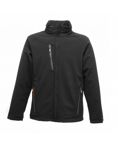 Stretch-Softshell-Außenseite mit warmer Rückseite, wasserdichter und atmungsaktiver Isotex 5000-Membran-Dropliner, Polyesterfutter an der Kapuze, windabweisend, verschweißte Nähte, einklappbare Kapuze, reflektierende Paspelbesätze an den Taschen, 2 untere und 1 wasserabweisende Brusttaschen mit Reißverschluss, verstellbare Ärmelbündchen, verstellbare Stoßkordel Saum, verdeckter Reißverschlusseinstieg im Futter für Stickzugang