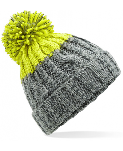 Merkmale TearAway-Label für einfaches Rebranding, schweres, mehrfädiges Zopfstrick-Design, kräftiges zweifarbiges Design, luxuriöser Pompon, luxuriöses Shearling-Thermoband für zusätzliche Wärme, Manschettendesign für optimale Dekoration