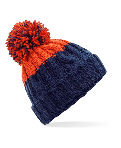 Merkmale TearAway-Label für einfaches Rebranding, schweres, mehrfädiges Zopfstrick-Design, kräftiges zweifarbiges Design, luxuriöser Pompon, luxuriöses Shearling-Thermoband für zusätzliche Wärme, Manschettendesign für optimale Dekoration