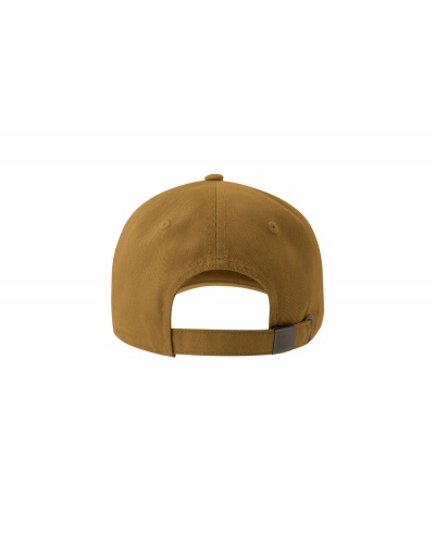 Die unstrukturierte Kappe besteht aus einer Mischung aus recycelter und Bio-Baumwolle. Befestigung hinten mit einer Schnalle mit Metallloch.