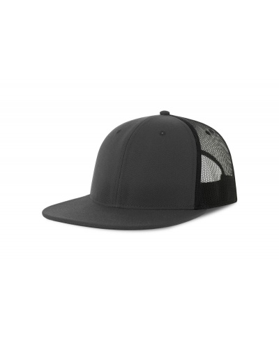 Flacher Schirm, PVC-Verschluss, Schweißband: 35 % Baumwolle / 65 % Polyester, Kontrastschirm, genähte Lüftungsschlitze, hinteres Netz, seitliches Netz, strukturiertes Frontpanel, 6 Nähte am Schirm.