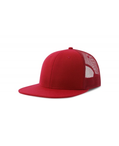 Flacher Schirm, PVC-Verschluss, Schweißband: 35 % Baumwolle / 65 % Polyester, Kontrastschirm, genähte Lüftungsschlitze, hinteres Netz, seitliches Netz, strukturiertes Frontpanel, 6 Nähte am Schirm.