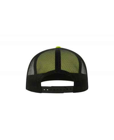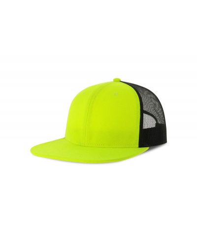 Flacher Schirm, PVC-Verschluss, Schweißband: 35 % Baumwolle / 65 % Polyester, Kontrastschirm, genähte Lüftungsschlitze, hinteres Netz, seitliches Netz, strukturiertes Frontpanel, 6 Nähte am Schirm.