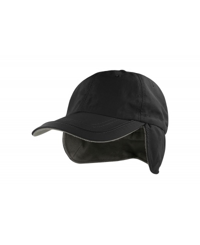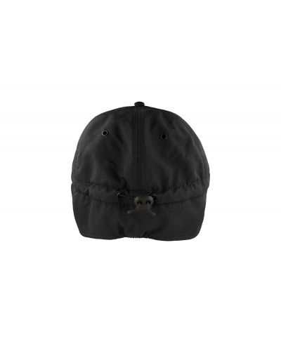 Outdoor-Wintermütze mit Ohrenklappen aus recyceltem Nylon. Wasserabweisende Außenseite und recyceltes Polarfleece innen. Unstrukturierte Frontplatten und gebogenes Visier. Verstellbarer Verschluss mit elastischen Kordeln und Stopper.