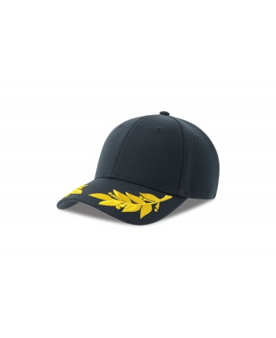 Eine Mütze aus recyceltem Polyester-Twill mit einem Schirm, der mit feierlichen Lorbeerblättern verziert ist. Sie ist das ideale Accessoire für Preisverleihungen oder als Werbegeschenk bei Wettbewerben. Der recycelte ReTraze®-Schirm und das Metallband mit Verschluss runden das Design ab.