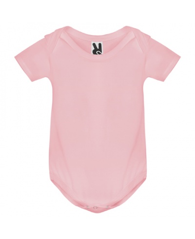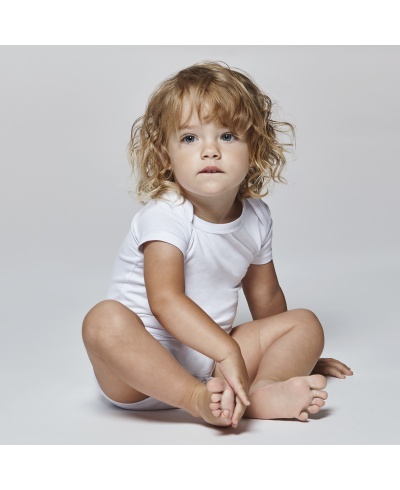 Baby Strampler. 1x1 Rippstrick-Bündchen am Rundhals und unten. Druckknopfverschluss im Schritt. Überlappende Schulterpartie für besonders leichtes An- und Ausziehen.