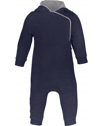 85% Baumwolle / 15% Viskose für Farbton Oxford Grey. 100% Baumwolle für Farbton Navy. Ungebürstetes Fleece. Vorne Öffnung mit Reißverschluß und Druckknöpfen. Kapuze inwendig in Kontrastfarbe. Rippbündchen an Arm und Beinabschluß.