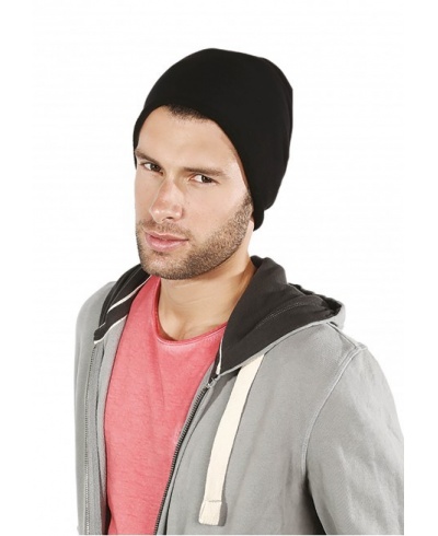 100 % Baumwolle. Lange Mütze mit gerolltem Rand.