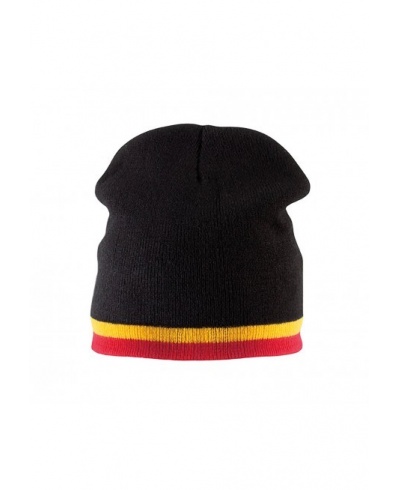 100% Acryl. Strickmütze mit Kontraststreifen am Rand.