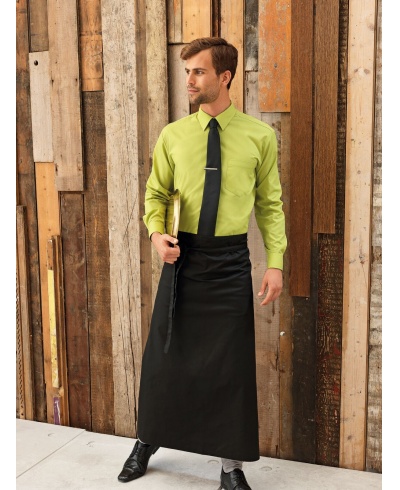 Eine sehr populäre Art der Taillenschürze, die zu einer extra langen Länge hängt und dem Träger maximalen Schutz gegen das Verschütten gibt. Die Stoffbindungen sind lang genug, um an der Vorderseite doppelt gebunden und gebunden zu werden. Diese Bistro-Schürze ist eine einfache und raffinierte Lösung für das Personal vor Ort.