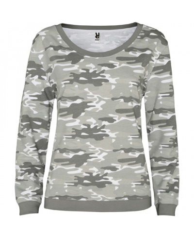 Damen Sweatshirt, Camouflage-Design. Weiter Halsausschnitt. Kontrastfarben: 1x1 gerippter Rundhalsausschnitt, Ärmelbündchen und Saum.