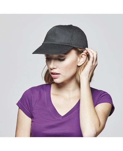 5-Panel Cap. 2 gestickte Luftösen. 4-fach gesteppter Schirm. Schweißband innen. Verstellbarer Klettverschluss.