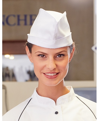 Schiffchen mit Klettverschluss, Bundbreite ca. 5,5 cm, nach hinten schmaler zulaufend 95° C waschbar, knitterarm, pflegeleicht, farbecht, industriewäsche- und finishertauglich.