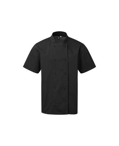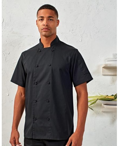 Eine kurzärmlige Kochjacke aus unserem eigenen Coolchecker®-Stoff. Die mittlere Rückwand besteht aus dem Coolchecker®-Gewebe, das außergewöhnliche Feuchtigkeitsregulierung und Dochtwirkungseigenschaften bietet, sodass der Koch während des Servierens frisch und kühl bleibt. Ein Wickelverschluss mit zehn Knöpfen aus demselben Stoff, ein Stehkragen und eine praktische doppelte Stifttasche am linken Arm.