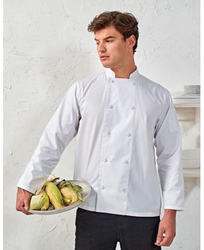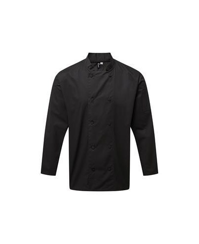 Eine langärmlige Kochjacke aus unserem eigenen Coolchecker®-Stoff. Die mittlere Rückwand besteht aus dem Coolchecker®-Gewebe, das außergewöhnliche Feuchtigkeitsregulierung und Dochtwirkungseigenschaften bietet, sodass der Koch während des Servierens frisch und kühl bleibt. Ein Wickelverschluss mit zehn Knöpfen aus demselben Stoff, ein Stehkragen und eine praktische doppelte Stifttasche am linken Arm.