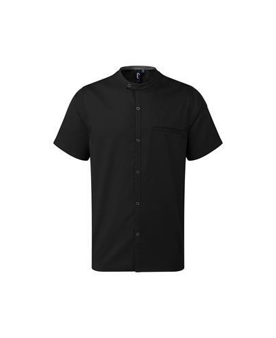 Dieses moderne Kochhemd mit Stehkragen kombiniert die Strapazierfähigkeit einer Kochjacke mit der Leichtigkeit eines Hemdes. Asymmetrischer Mandarinkragen mit Druckknöpfen an der Vorderseite für einfaches Tragen. Ein kontrastierender innerer Nackenbund hilft, Flecken durch täglichen Gebrauch zu verbergen. Die Tasche kann verschoben werden, um Platz für Stickereien zu schaffen. Hergestellt aus einer Kombination von recyceltem Polyester und Baumwolle.