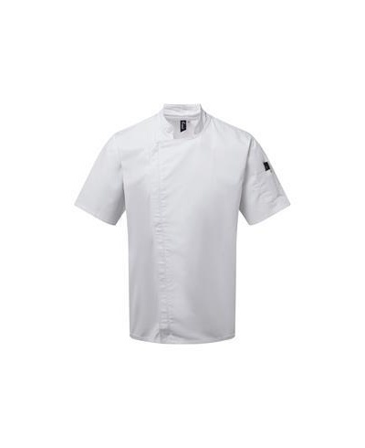 Eine bequeme Kochjacke zum Überziehen mit verdecktem Reißverschluss. Die beiden Denim-Modelle verfügen über Einsätze in umgekehrter Farbe unter dem Arm und an den Seiten, während die weiße Version über einen atmungsaktiven Mesh-Einsatz unter dem Arm verfügt. Mit Stehkragen und seitlichen Schlitzen für einen typischen Stil, der in vielen Küchenumgebungen zu finden ist.