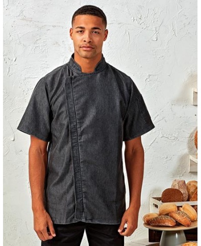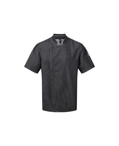 Eine bequeme Kochjacke zum Überziehen mit verdecktem Reißverschluss. Die beiden Denim-Modelle verfügen über Einsätze in umgekehrter Farbe unter dem Arm und an den Seiten, während die weiße Version über einen atmungsaktiven Mesh-Einsatz unter dem Arm verfügt. Mit Stehkragen und seitlichen Schlitzen für einen typischen Stil, der in vielen Küchenumgebungen zu finden ist.