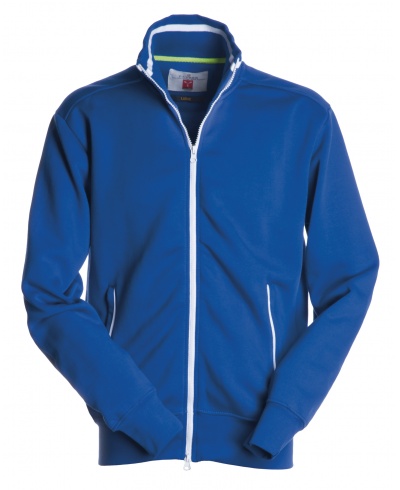 Kinder-Sweatjacke mit durchgehendem 2-Wege-SBS-Reißverschluss aus Kunststoff in Kontrastfarbe mit Metallschieber, kontrastfarbiger Einfassung auf dem Rippstrickkragen und auf den Seitentaschen, Kugelärmeln, zwei Außentaschen mit Reißverschlüssen in Kontrastfarbe, elastischem Feinripp an Ärmeln und Taille, verstärkten Nähten
