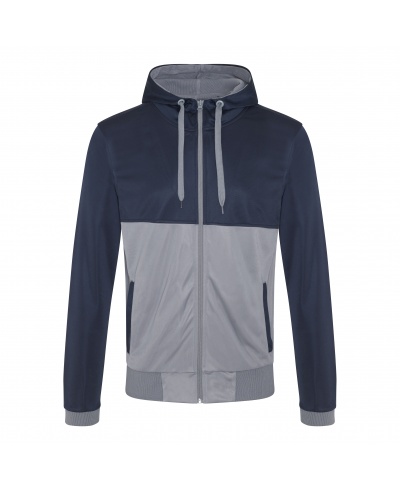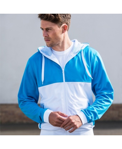 Modern contrast panelling – top yoke, sleeves and hood are one colour, and bottom half of body, cuffs, hem, draw cords and hood mesh are contrast colour.