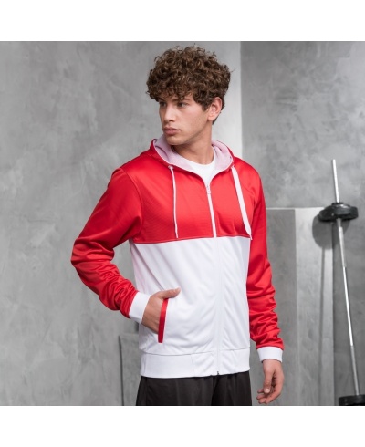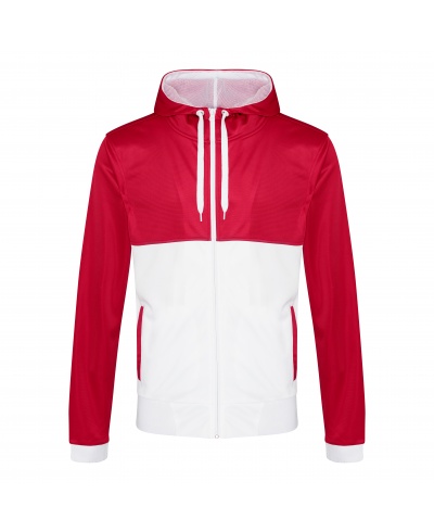 Modern contrast panelling – top yoke, sleeves and hood are one colour, and bottom half of body, cuffs, hem, draw cords and hood mesh are contrast colour.