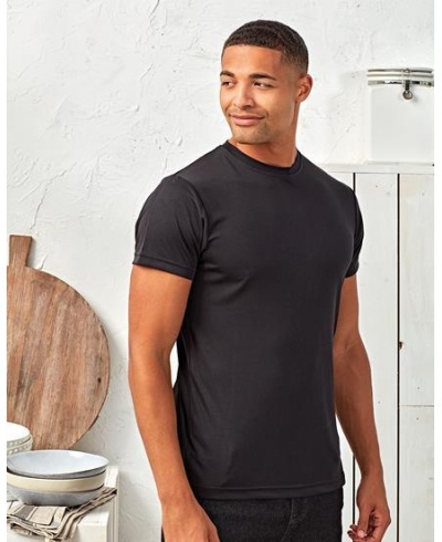 Dieses leichte Coolchecker®-T-Shirt ist eine lässige Alternative zu einer Kochjacke. Es leitet Feuchtigkeit vom Körper ab und trocknet schnell, damit der Koch beim Servieren frisch und kühl bleibt.