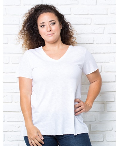 Glockenförmig. Single-Jersey. V-Ausschnitt. Ärmel und Boden unvollendet. Kragenband. 1x1 Rippenhals.