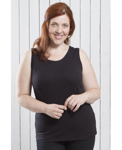Glockenförmiges Top mit Trägern. Doppelte Naht unten. Kragen und Armloch gerippt.