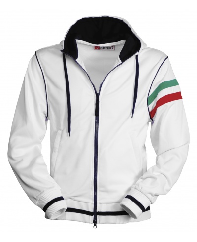 Damen-Kapuzenpullover mit durchgehendem, kontrastierendem Kunststoffreißverschluss mit doppeltem Metallzug. Kontrastierende Kapuze und Tunnelzug, kontrastierende Stretch-Rippbündchen und -saum, kontrastierende Bündchen, Ziernähte (Farben der Flagge) auf dem linken Ärmel, 2 Taschen mit Reißverschluss, verstärkte Nähte und Pique-Gewebe für mehr Atmungsaktivität