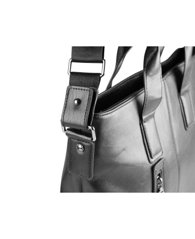 Akten-/Tablet-Tasche aus PU-Lederimitat. Innenfach mit Reißverschluß für Tablet, Reißverschluß oben, verstellbarer Schultergurt. SBS-Reißverschlüsse. Metallschnallen und -karabiner.