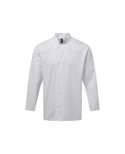 Eine strapazierfähige Kochjacke mit langen Ärmeln, die an der rechten Körperseite mit fünf langlebigen Harzknöpfen befestigt wird. Am oberen linken Ärmel befindet sich ein praktisches Doppelfach für Stifte. Diese Jacke hat einen Stehkragen, ist in Schwarz und Weiß erhältlich und bietet ein hervorragendes Preis-Leistungs-Verhältnis.