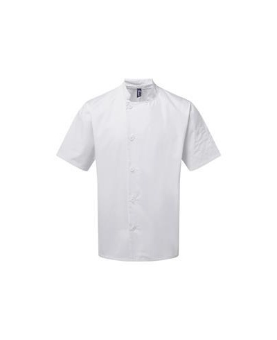 Eine strapazierfähige Kochjacke mit kurzen Ärmeln, die an der rechten Körperseite mit fünf langlebigen Harzknöpfen befestigt wird. Am oberen linken Ärmel befindet sich ein praktisches Doppelfach für Stifte. Diese Jacke hat einen Stehkragen, ist in Schwarz und Weiß erhältlich und bietet ein hervorragendes Preis-Leistungs-Verhältnis.