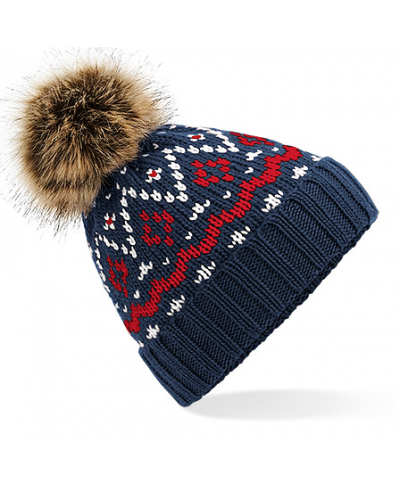 TearAway-Label für einfaches Rebranding, zeitloses Fair-Isle-Muster, abnehmbarer Luxus-Bommel aus Kunstpelz, kompatibel mit austauschbaren Pop Pom-Produkten, Manschettendesign für optimale Dekoration