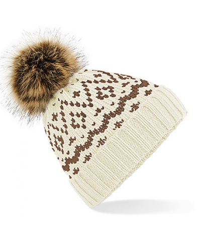 TearAway-Label für einfaches Rebranding, zeitloses Fair-Isle-Muster, abnehmbarer Luxus-Bommel aus Kunstpelz, kompatibel mit austauschbaren Pop Pom-Produkten, Manschettendesign für optimale Dekoration