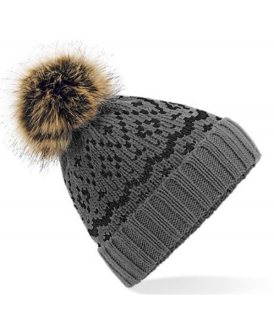 TearAway-Label für einfaches Rebranding, zeitloses Fair-Isle-Muster, abnehmbarer Luxus-Bommel aus Kunstpelz, kompatibel mit austauschbaren Pop Pom-Produkten, Manschettendesign für optimale Dekoration