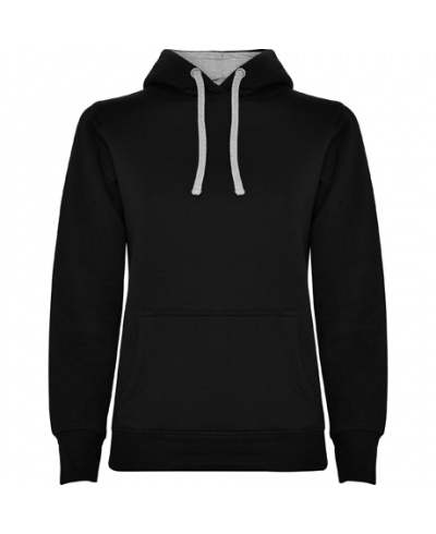 Tailliertes Damen Kapuzensweat. Kapuzenfutter, Kordelzug und Metalösen in Kontrastfarbe. Nackenband mit Fischgrätmuster. Kängurutasche. Ärmelbündchen und Saum mit 1x1 Rippstrick und Elasthan. Ärmelbündchen mit Daumenöffnung.