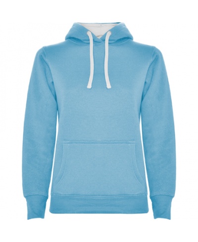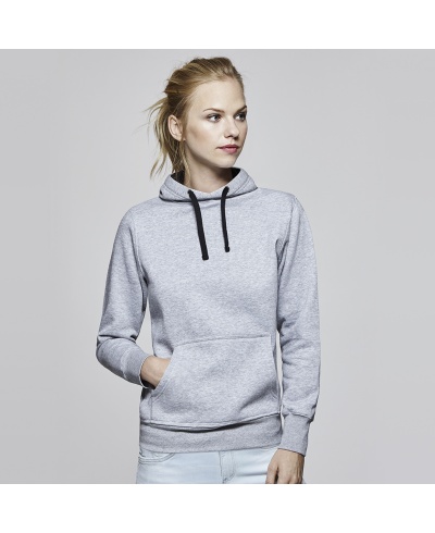 Tailliertes Damen Kapuzensweat. Kapuzenfutter, Kordelzug und Metalösen in Kontrastfarbe. Nackenband mit Fischgrätmuster. Kängurutasche. Ärmelbündchen und Saum mit 1x1 Rippstrick und Elasthan. Ärmelbündchen mit Daumenöffnung.