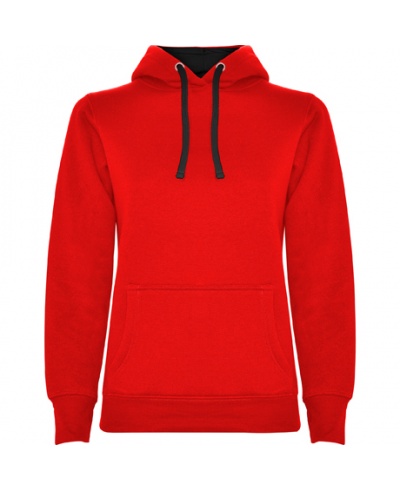 Tailliertes Damen Kapuzensweat. Kapuzenfutter, Kordelzug und Metalösen in Kontrastfarbe. Nackenband mit Fischgrätmuster. Kängurutasche. Ärmelbündchen und Saum mit 1x1 Rippstrick und Elasthan. Ärmelbündchen mit Daumenöffnung.