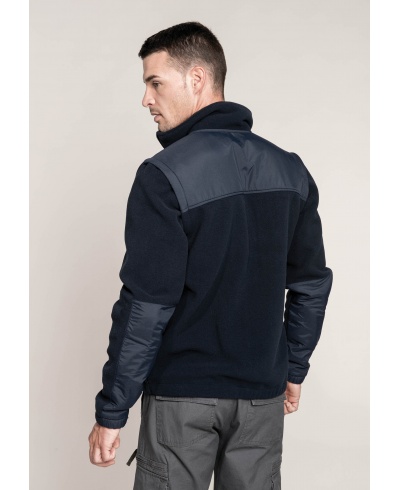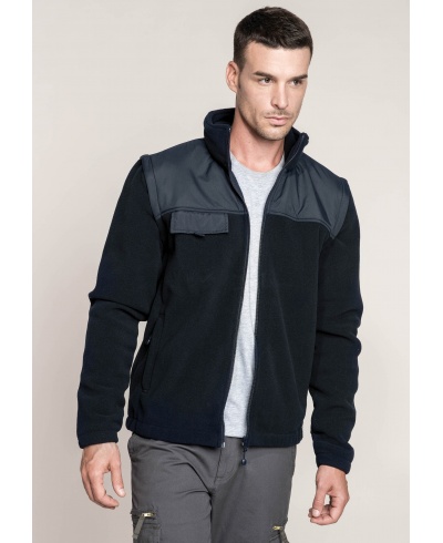 Außenmaterial: 100 % Polyesterfleece 400 g/m². Verstärkungen 100 % Polyester-Taslan mit Acrylbeschichtung. Ärmel mit 210T Polyester-Innenfutter. 2-in-1-Fleecejacke. 2 Reißverschluss-Vordertaschen und 1 Reißverschluss-Brusttasche mit Klappe und Klettverschluss. Besätze Ton-in-Ton vorn, hinten und an den Unterarmen. Front und Rücken leicht veredelbar. Polyester gefütterte, abnehmbare Ärmel für mehr Komfort. Ärmelbündchen und Bund elastisch.