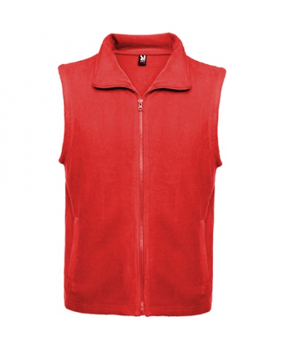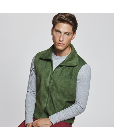 Fleece Weste mit hohem Kragen. Durchgehender Reißverschluss und Reißverschlüsse der Seitentaschen gleichfarbig.