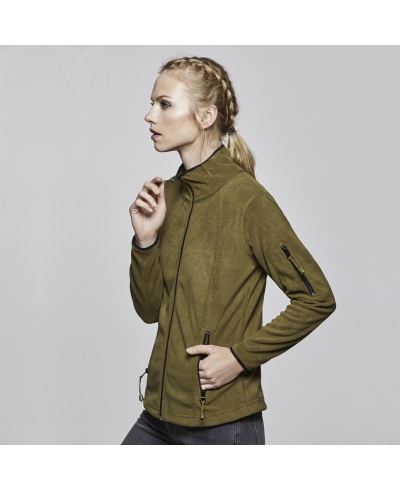 Microfleece Jacke für den freizeitsport mit hohem Kragen. Kontrastfarben an Kragen- und Ärmelbündchen, am durchgehenden Reißverschluss und an Reißverschlüssen der Seiten- und linken Ärmeltaschen. Ziernähte an den Seiten und im Frontbereich. Ellenbogenschoner aus gleichem Material.