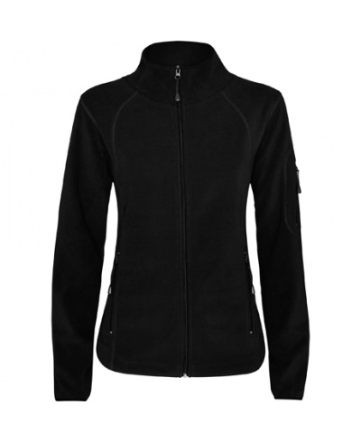 Microfleece Jacke für den freizeitsport mit hohem Kragen. Kontrastfarben an Kragen- und Ärmelbündchen, am durchgehenden Reißverschluss und an Reißverschlüssen der Seiten- und linken Ärmeltaschen. Ziernähte an den Seiten und im Frontbereich. Ellenbogenschoner aus gleichem Material.
