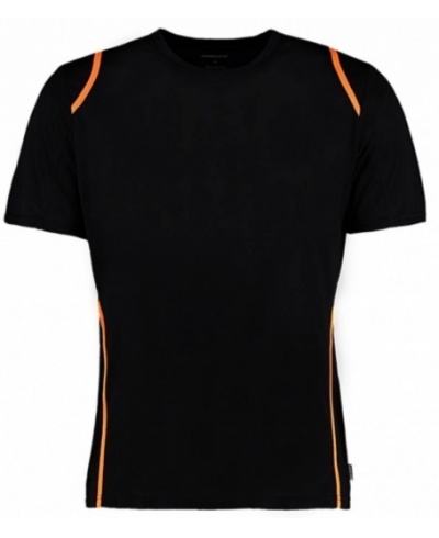 140 g/qm • 100% Polyester • atmungsaktives Strukturfunktionsshirt • Nackenband • Aufgesetzte schmale Kontraststreifen über Schulter, Rücken und Seiten verlaufend • Seitennähte • Doppelnähte an den Abschlüssen.