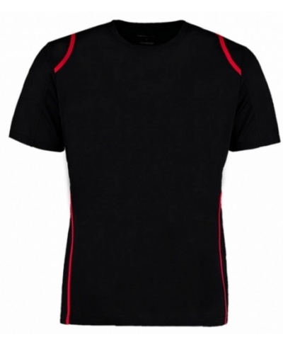 140 g/qm • 100% Polyester • atmungsaktives Strukturfunktionsshirt • Nackenband • Aufgesetzte schmale Kontraststreifen über Schulter, Rücken und Seiten verlaufend • Seitennähte • Doppelnähte an den Abschlüssen.