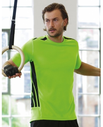 140 g/qm • 100% Polyester (Micro Mesh) • Atmungsaktiv • Rundhals • Im Nacken eingedruckte Produktinfos • Kontrasteinsätze an Seiten und Schulter • Ziernaht an Kontrasteinsatz • Abgerundeter Rücken • Gerader Saum vorne.