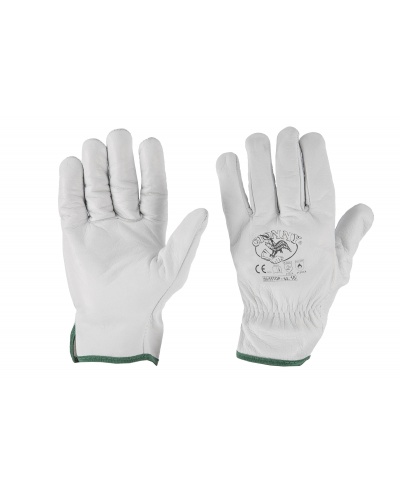 Rindsleder vollnarbig eingefasst; Eigenschaften: weich, stark, widerstandsfähig; Stärken: Komfort, einfach zu bedienen; Anwendungsbereiche: allgemeine Handhabung bei trockenen Bedingungen