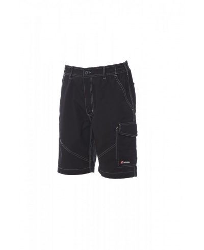 Herren Bermudashorts, seitliche Gummi- und Hüftgurtschlaufen, Reißverschluss mit Kunststoffknopf, zwei klassische Fronttaschen, eine Seitentasche mit LOCK SYSTEM, eine Maßbandtasche, zwei Gesäßtaschen, eine mit Klappe und eine mit Klettverschluss, Kontrasteinsätze und Nähte, reflektierende Streifen auf der Gesäßtasche, dreifache Nähte