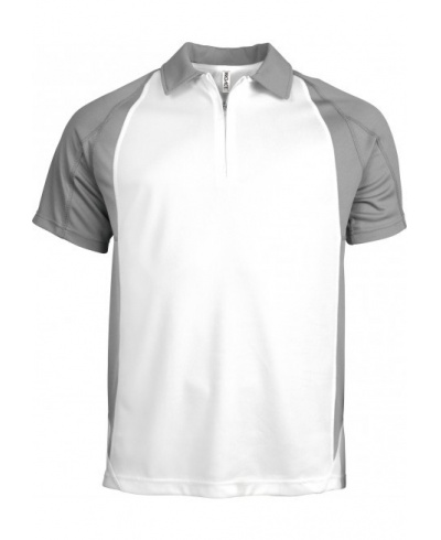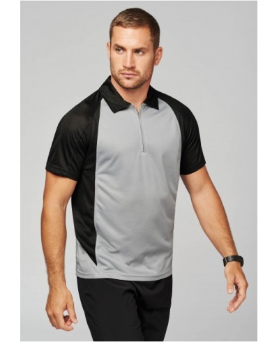 100% Polyester. Ultraleicht und schnelltrocknend. Polokragen mit Nylon-Reißverschluß und Paspeln. Raglanärmel in Kontrastfarbe. Stoffüberlappungen an Ärmeln. Doppelnahtverarbeitung am unteren Ende, an den Ärmeln, am Halsausschnitt.