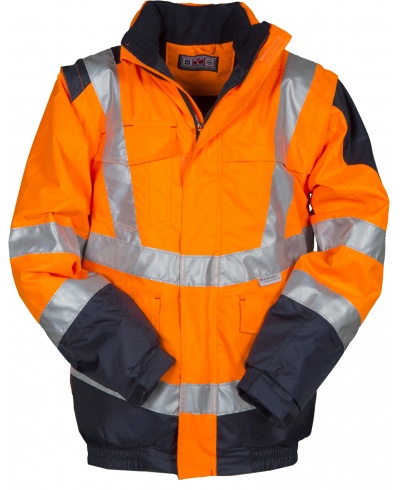 Zweifarbige, gut sichtbare Herrenjacke mit 3M-Streifen mit abtrennbaren Ärmeln, verdecktem Reißverschluss aus Kunststoff mit Metallschieber und Klettverschluss, vorgeformter, im Kragen einrollbarer oder abnehmbarer Kapuze mit Kordelzug, elastischer Taille, Ärmelbündchen mit Weitenregulierung, vier geräumigen Vordertaschen, davon zwei mit Reißverschluss, einer Brusttasche mit Stifthalter und Steckfach für den Ausweis und einer Tasche mit verdecktem Reißverschluss; Innenseite: wattiert, Fleecekragen und -schultern, Reißverschluss zum einfacheren Veredeln mit Druck und Stick, warmversiegelte Nähte