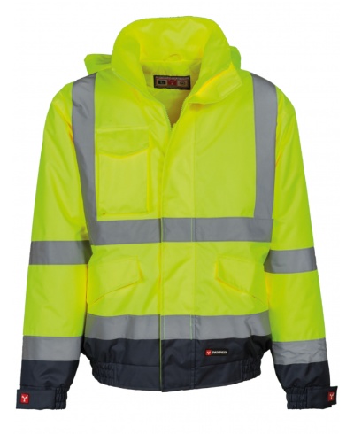 Zweifarbige Warnschutzjacke mit Reflexstreifen, verschweißten Nähten und Einsteckkapuze; mit durchgehendem, verdeckten Reißverschluss, elastischem Bund und Bündchen, 2 großen vorderen Taschen mit Klappe und Klett, Handytasche und Haltering für Abzeichen